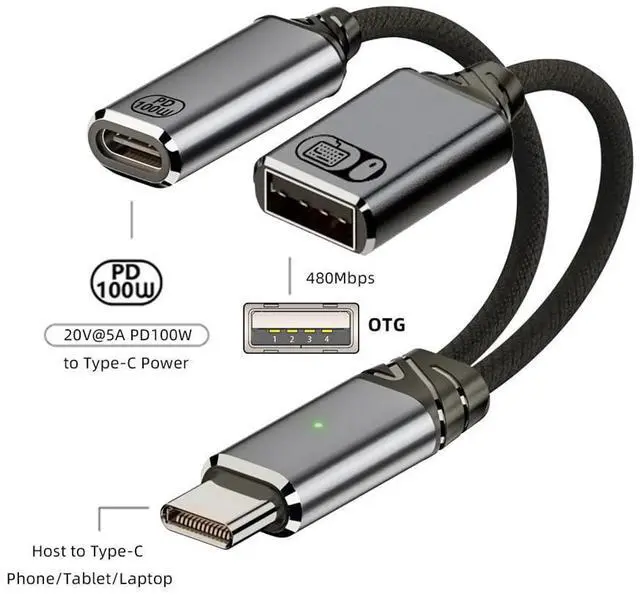 USB-C Type-C to 480Mbps USB 2.0 Female OTG & 100W PD Power Cable for Laptop Tablet Phone