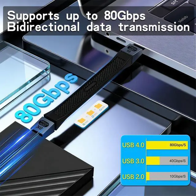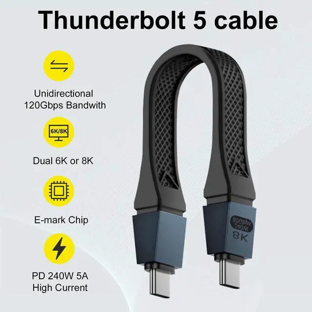 80Gbps High Speed TransferShort usb c to usb c cable can support 80Gbps of bi-directional data transfer, 120Gbps of video bandwidth. And this thunderbolt 5 cable is perfect for professionals, gamers, and anyone who demands fast and reliable data transfer.