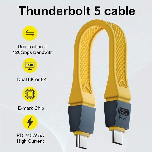 80Gbps High Speed TransferShort usb c to usb c cable can support 80Gbps of bi-directional data transfer, 120Gbps of video bandwidth. And this thunderbolt 5 cable is perfect for professionals, gamers, and anyone who demands fast and reliable data transfer.