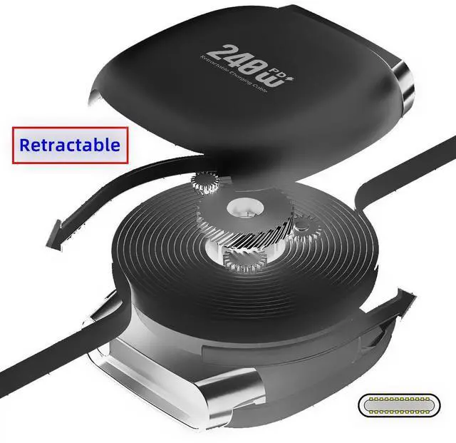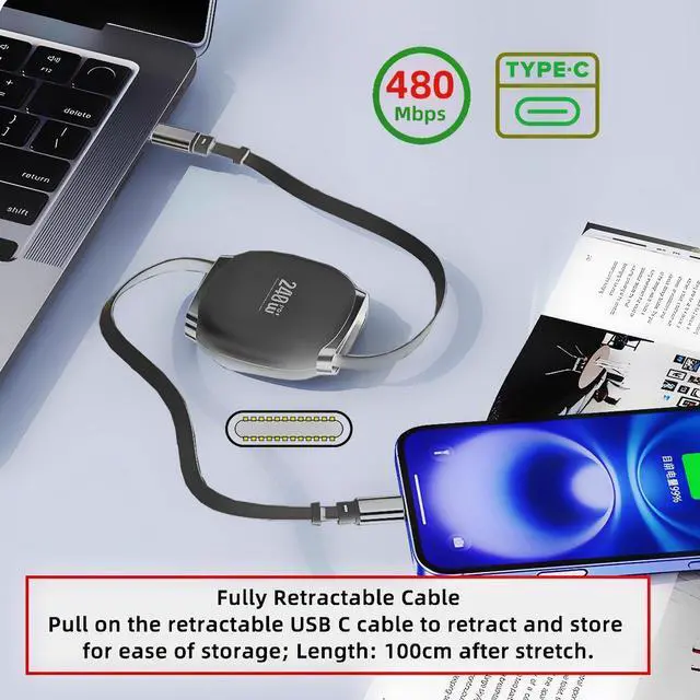• 1) Extendable on Both Sides:Adjust the retractable charger cable length to your desired convenience by pulling on either side of the Type C to Type C cable for better accessibility.