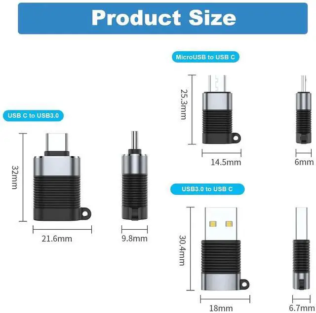 What you'll get2 x micro USB male to USB C adapter, 2 x USB male to USB C adapter, 2 x USB C male to USB adapter. And they can be connected to each other for charging and data transfer.