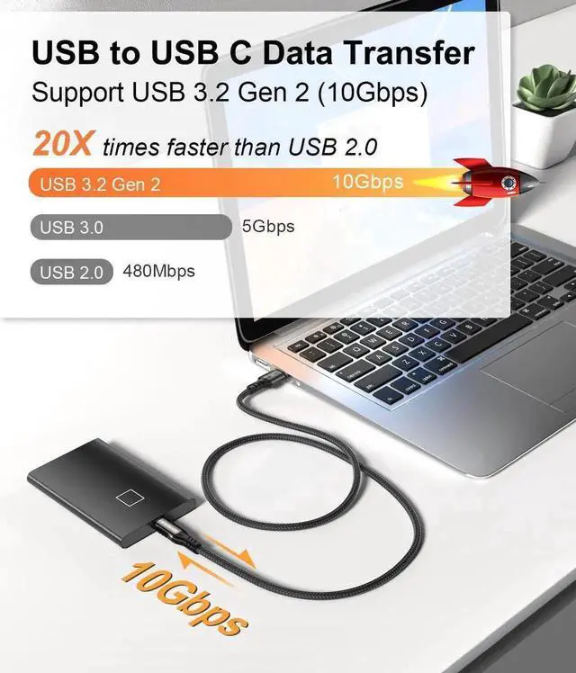 USB to USB C 3.1 / 3.2 Gen 2 Cable, 10Gbps Data Transfer & Fast Charging 2 in 1 Cable