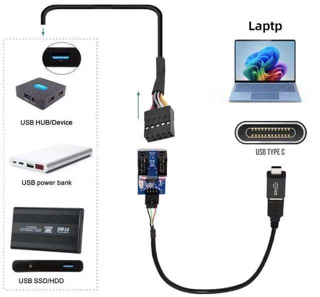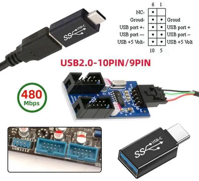4) Desktop 9-Pin USB HUB USB 2.0 9 pin Connector Adapter Port Multilier, With back glue, can be directly fixed on the main board or chassis.