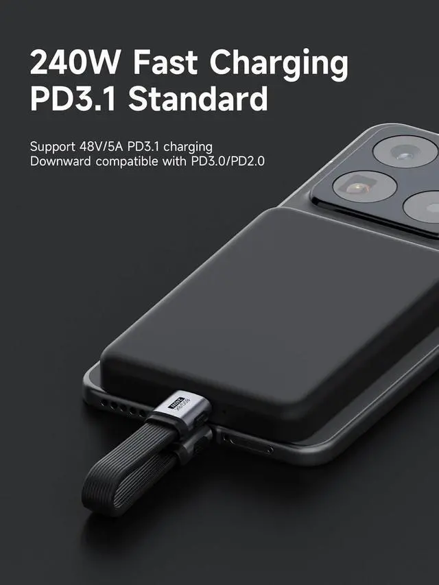 240W Fast Charging: Built-in E-marker chip, PD 3.1 standard supports 240W fast charging, while it is backward compatible with PD3.0 and 2.0 protocols,Supports high power output of up to 48V5A. And also compatible with 140/100/60W power devices. Charge USB C devices from phones to laptops