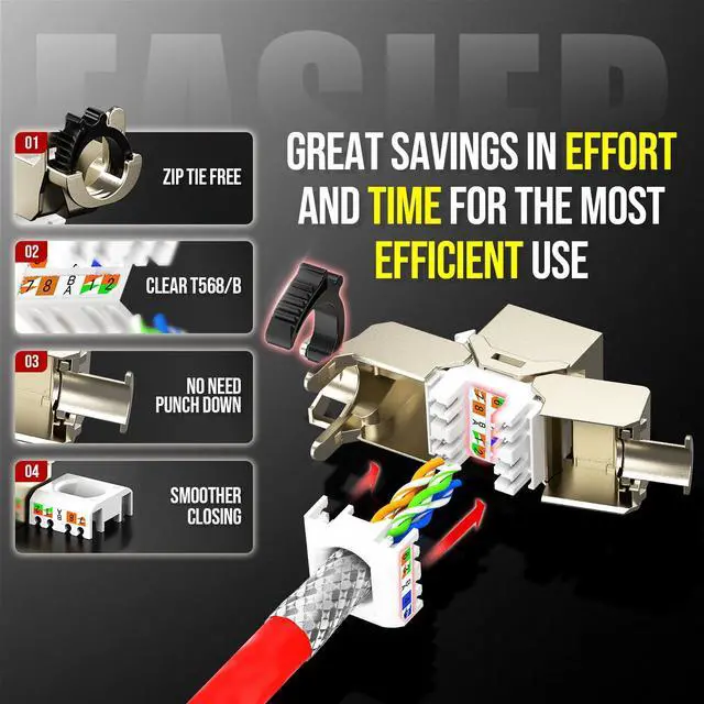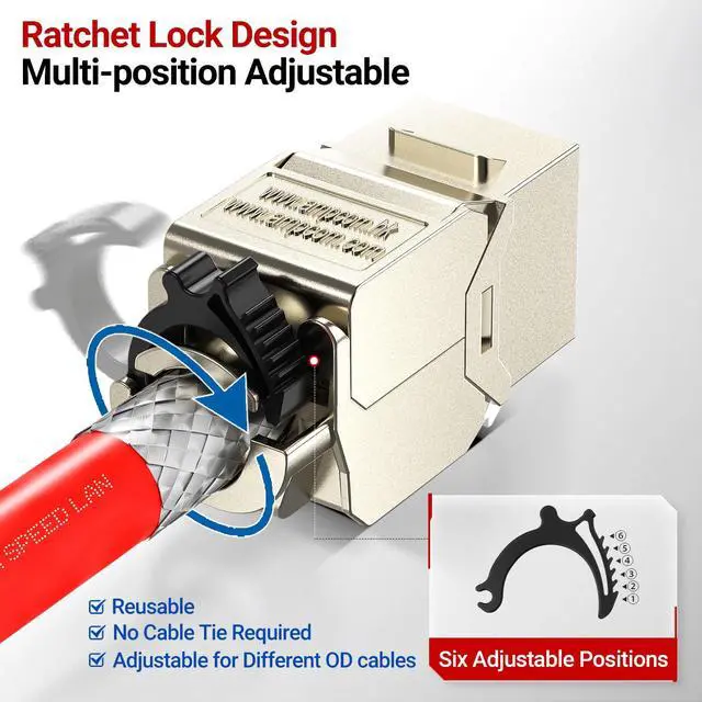This CAT 8 keystone jacket, fully shielded and self-locking, is designed for effortless snap-in assembly in keystone patch panels, surface mount boxes, or wall plates (face plates). Ratchet Zip-Tie End for adjustable tightening strength, time and labor Saving and minimal waste production