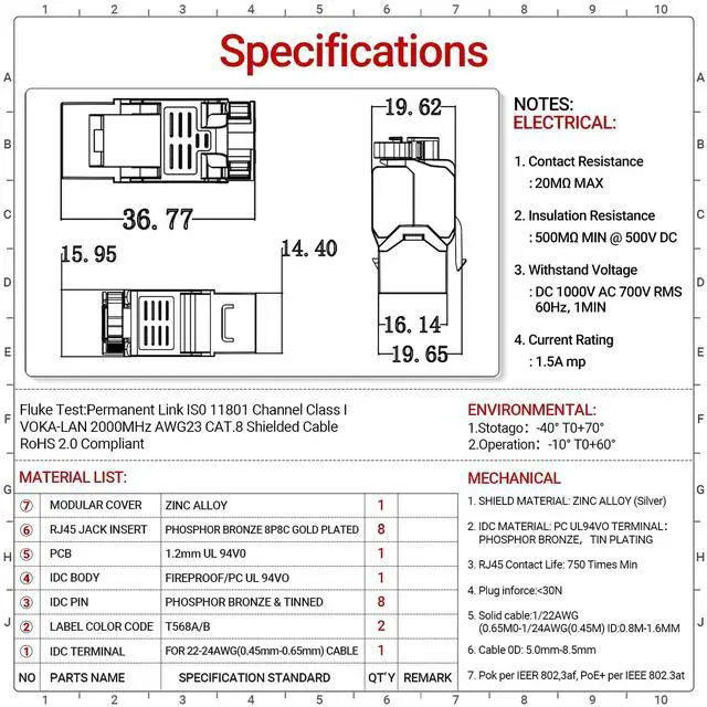 Package include: 12 x STP CAT 8 Keystone module Connectors; 12 x Shielded Copper Foil Tapes; 12 x RJ45 Dust Covers