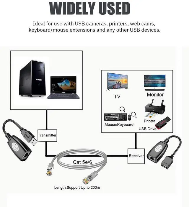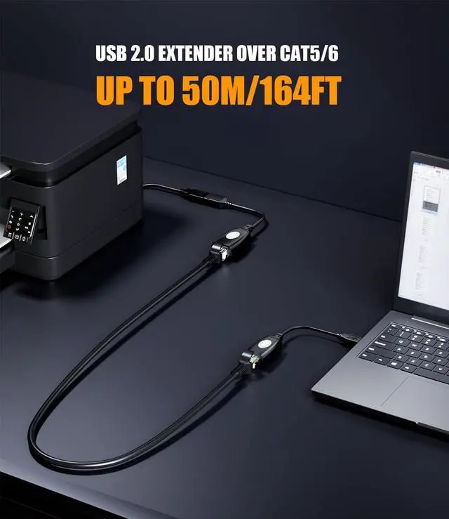 The maximum distance between this USB device and the computer can reach 150 feet,But more than 30 feet need to be completed with high-quality network cable.Otherwise it will lead to instability!Ordinary network cable under 30 feet is enough!