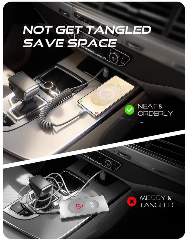 Neat & Safe Driving CompanionAre you tired of the messy cables in your car, and want to make your center console look neater? Carplay cable unique telescopic spring cable design avoids the drawbacks of ordinary straight cables, such as getting stuck on the gear lever or hanging near the accelerator/brake pedal that affect driving operations. It delivers a more focused and safe driving experience