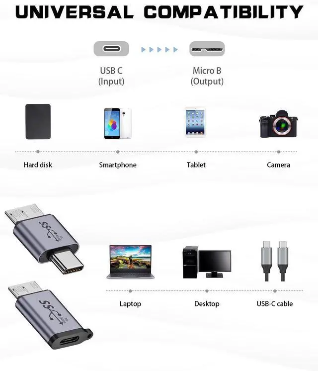 Comaptible for Micro B 3.0 DevicesThis USB C Hard Drive Adapter is ideal for USB 3.0 Portable External Hard Drive such as Portable SSD HDD WD, and support the charging and data transfer to smartphones & cameras.