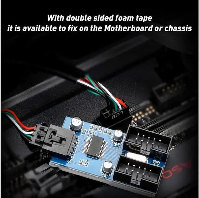 usb 2.0 splitter with double sided foam tape, it is available to fix on the main board or chassis.
