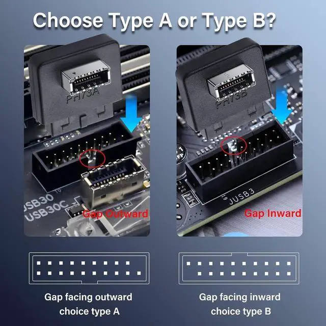 How to ChooseThere are two types of this adapter (A & B), which can be selected according to the gap of the 19P socket on the motherboard, the gap faces outside to select A type, and the gap faces inside to select B type