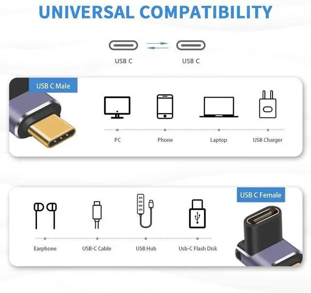 USB C Adapter 90 Degree: This USB C Adapter can provide data transfer speeds up to 40Gbps. Transfers movies, music and more in just seconds. Please noticed that the data transmission speed also depends on the USB devices and the cable support or not.