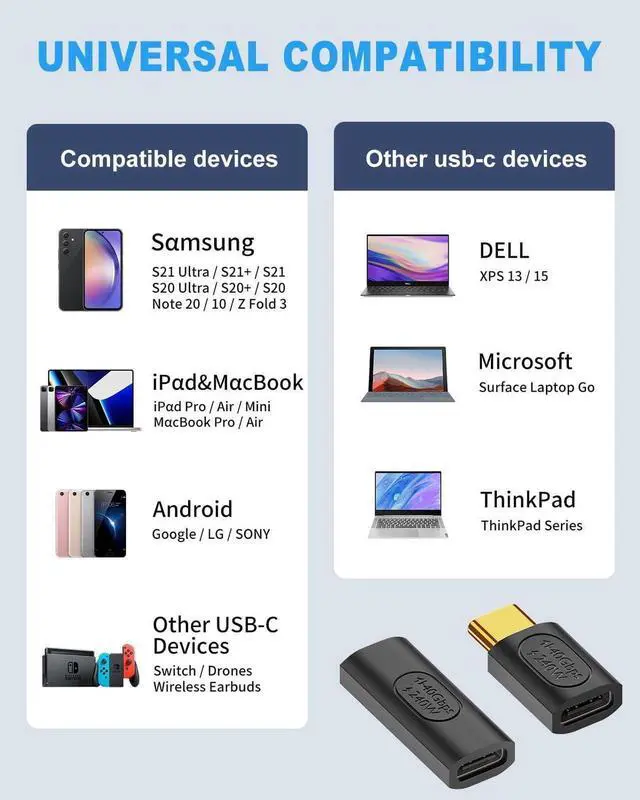 Wide use This USB C to USB C thunderbolt adapter can work on most USB C devices, such as Thunderbolt 3/4 MacBook Pro/Air, Steam Deck, PS5, Surface Book 2, iPhone 15/15 Plus/15 Pro/15 Pro Max, Galaxy S21 S20, S10, Note20 10, Pixel, Chromebook and other Type C devices.