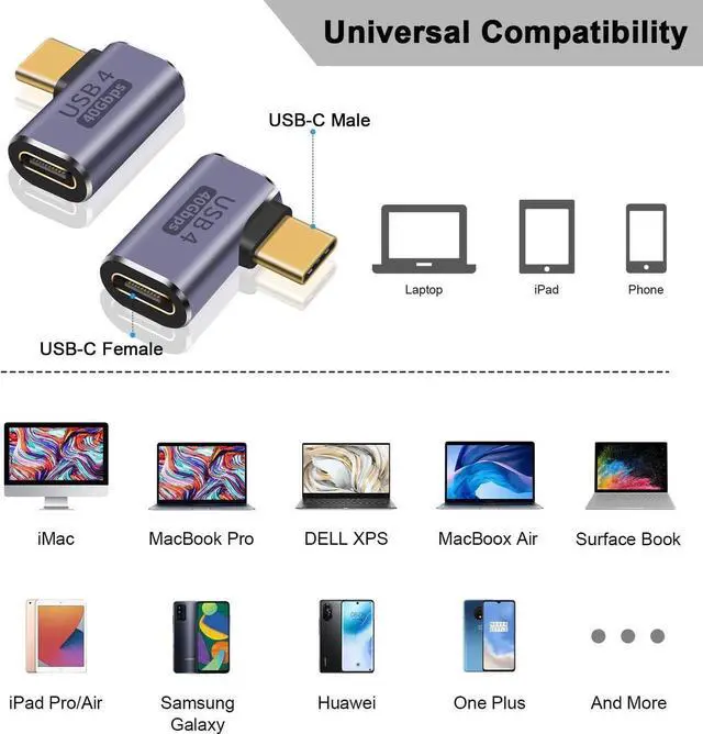 90 Degree USB C Adapter: High speed of 40Gbps Data Tranfer. Supports an amazing speed of up to 40Gbps to transmit data, 2x faster than standard USB C cable, high-speed charging up to 100W (5A/ 20V). All fully USB-C compatible. It can backward comaptible with USB 3.2 10Gb/s. Support 40Gb/s data transfer rate, efficient transfer Videos, pictures, files.