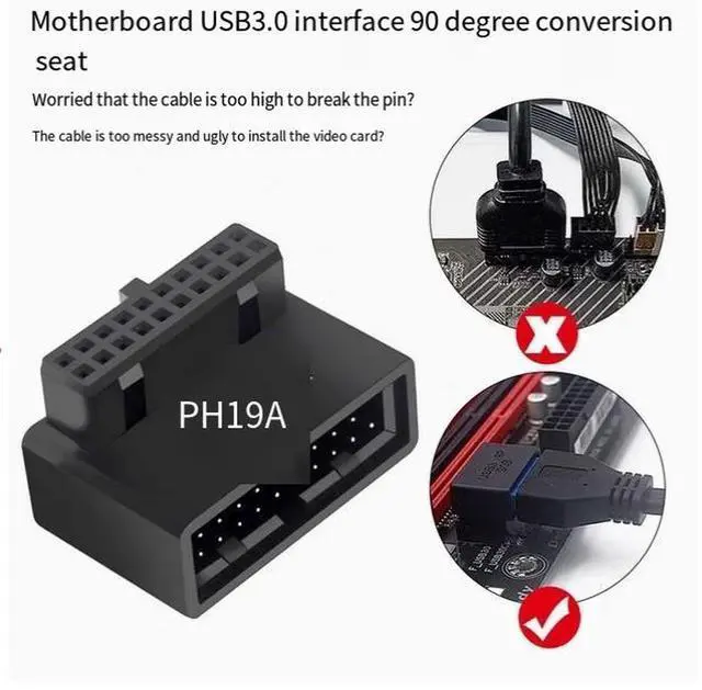 USB19PIN male/female socket product function: The computer motherboard vertical 19PN socket interface into an external bend, convenient topline daily most motherboard USB 3.0 interface are vertical wiring, not only the wiring is ugly, and the small motherboard is prone to graphics card is blocked by the chassis USB 3.0 cable and can not be installed, this product is a good solution to the wiring problem,