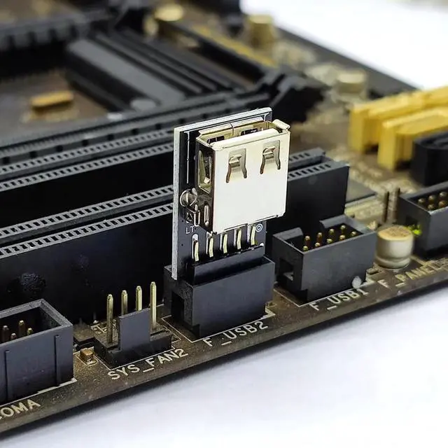 Desktop motherboard 9PIN to USB 2.0 adapter. Motherboard 9-pin female header expand USB 2.0 A female interfaces. Compatible with USB 1.1 as well. Connect USB devices such as dongle and wireless mouse receiver.
