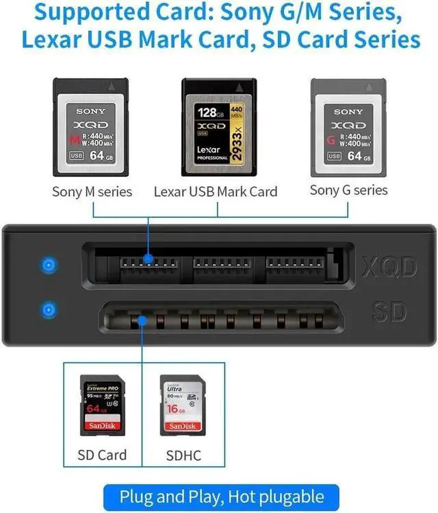 Designed for XQD 2.0 cards, Perfect support Sony G series, Sony M series, Lexar USB Mark card, SD Series (Such as SDHC, SDXC ect. )