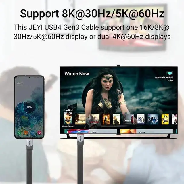 The newest USB4 Type-C cable, designed to streamline your workspace and deliver outstanding performance. This flat cable reduces clutter and provides plug-and-play connectivity for USB-C devices without signal loss. With an electronically marked chip, the cable is also safe for charging.