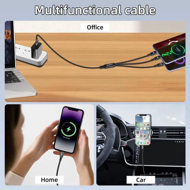 [Widely compatible]This triple USB C charging cable works effortlessly with most devices using USB C port, including phones, tablets, and laptops. Also charge IOS devices with USB-C port. Ideal for home, car, office, travel, or sharing with friends