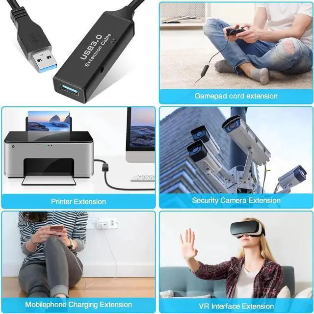 USB Active 3.0 Extension Cable, 32 Feet Type A Male to Type A Female USB Extender Wire High Speed 5Gbps Durable Extension Cord Charing Data Syn Transfer Connection Wire Compatible Oculus Rift, Xbox, PS4 and More. USB 3.0 Long Cable is suitable for using with hard-to-reach USB ports and out-of-sight wall chargers, you can extend the USB port to a more convenient and easy reach location, giving you the freedom to move away from your desktop while using your USB devices, no need to squeeze yourself to the back of the TV or desktop to connect usb disk or other usb peripherals anymore.
