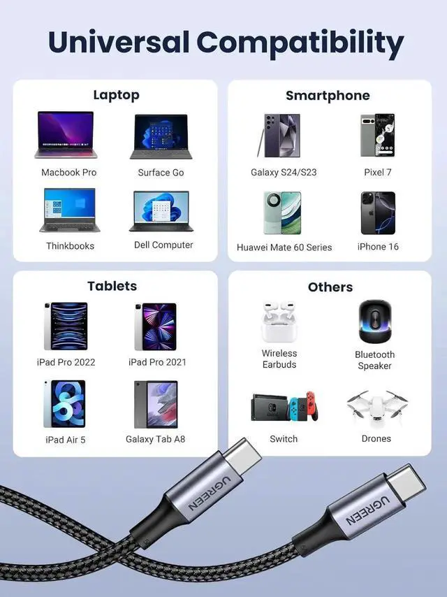 • Broad Device Compatibility: The USB C to USB C cable is widely compatible with USB-C devices, laptops like 2022 MacBook Pro, cellphones including iPhone 17/16/15 Series, SAM-SUNG S25/S24, Google Pixel, LG, tablets like iPad Pro and more