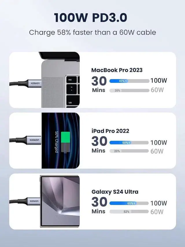 Fast Charging: The UGREEN USB C cable supports 100W fast charging with PD 3.0 and QC 3.0 technology to quickly charge iPhone 15 to 60% in just 30 minutes. Backwards compatible with 65W/45W/30W/20W chargers