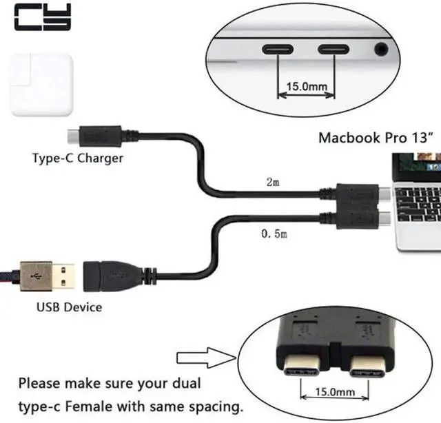 • Dual Cable USB 3.1 Type-C to USB-C USB 3.0 Female OTG Data Cable for New 13 inch Macbook Pro