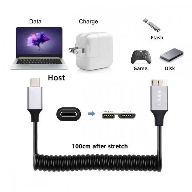 USB-C Type-C Host to Micro-USB 3.0 Male OTG Stretch Coiled Cable 100cm Extension 5Gbps for Disk Phone Camera Data