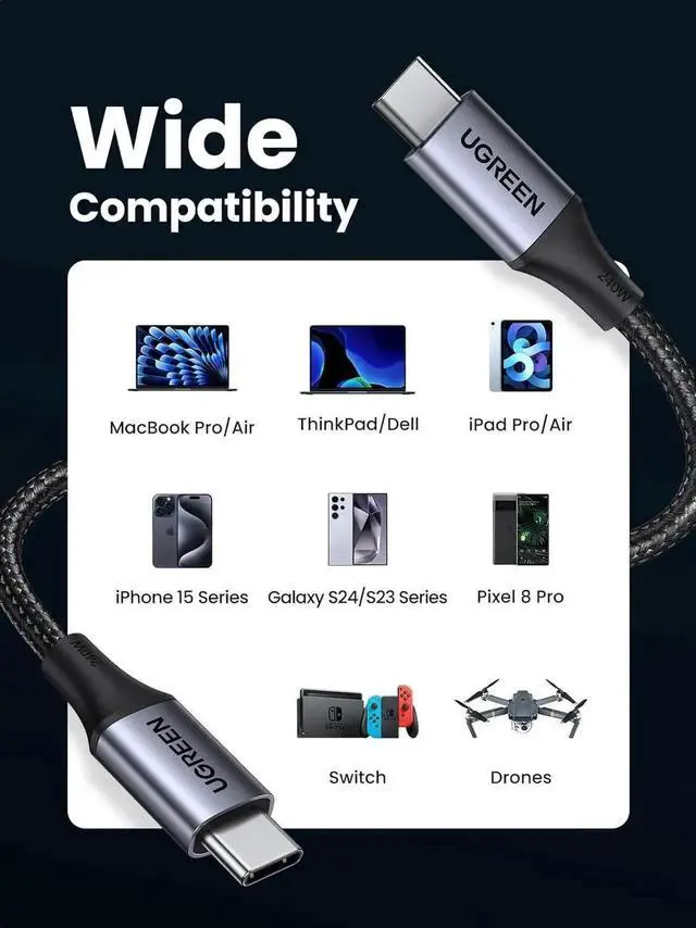 USB C Cable: Using the latest PD 3.1 technology, this USB C to USB C cable can charge the iPhone 15 from 0% to 85% in 35 minutes, and is compatible with 240W/140W/100W/60W/30W chargers