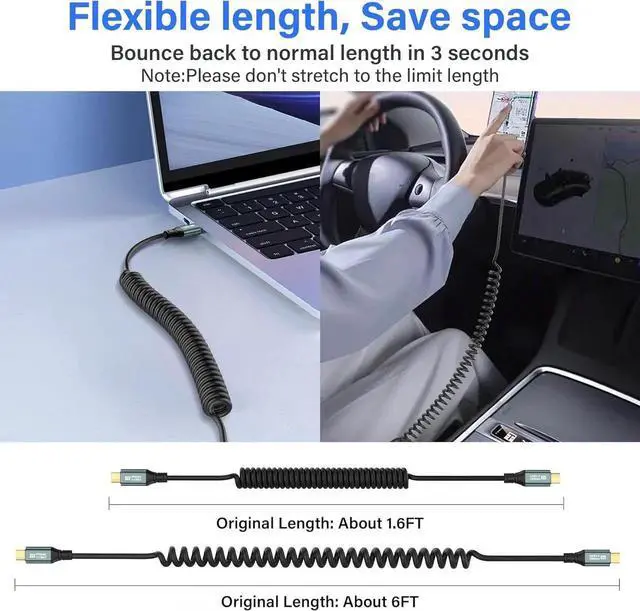 4. The USB Type-C car data cable adopts a spring-shaped design, which is easy to carry and does not need to be wrapped. 1.6 feet before stretching, stretches up to 5.9 feet to easily charge devices in the car, office, home or travel