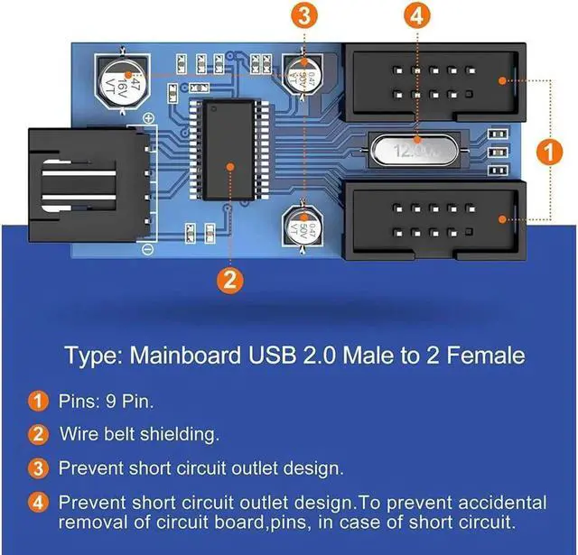 Extension USB 2.0 Splitter Motherboard, transfer speeds up to 480Mbps; easy to use, safe and reliable 9pin USB header 1 to 4 female extension cable card.