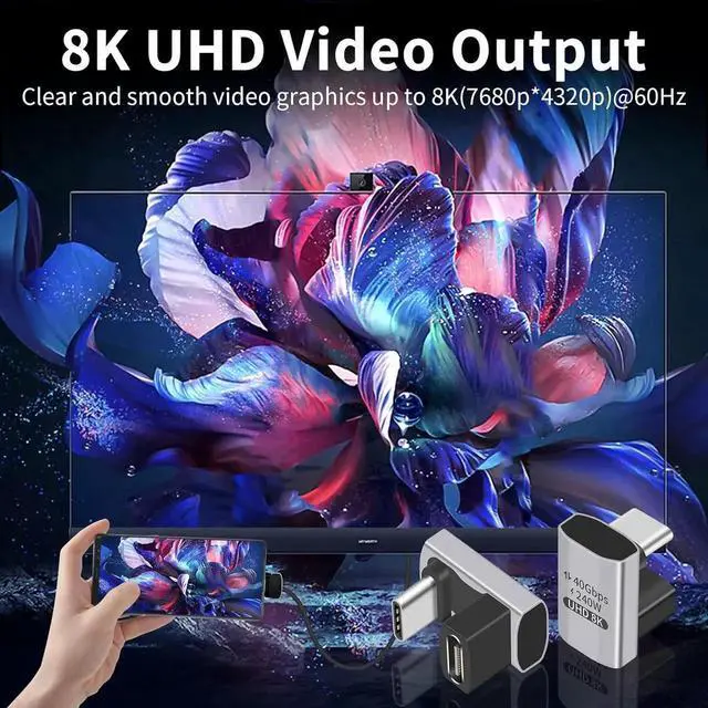 [40Gbps and 8K Video]: The USB C 180 degree adapter supports high-speed data transfer of up to 40Gbps, complying with the specifications and data transfer rates of USB4 cables. It also supports 8K@60Hz high-definition video and audio output. It is a fully functional usb c to usb c adapter