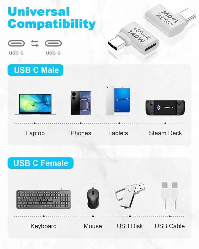 Supporting 40Gbps data transmission and 140W PD fast charging, this adapter ensures stable syncing, fast charging and smooth video output. It works seamlessly with MacBook, Nintendo Switch, Steam Deck, iPhone 15/16 Series, Samsung Galaxy and other USB-C phones, tablets and laptops.