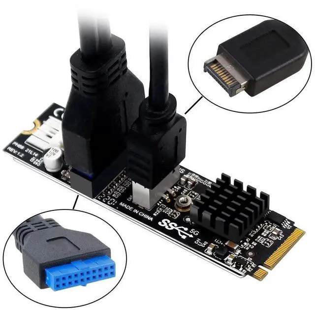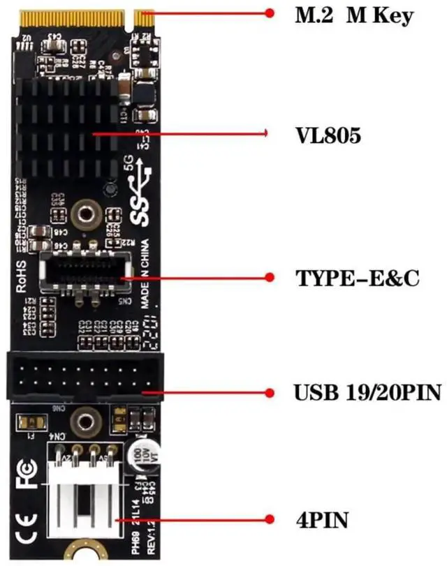 Aomoproing M.2 NVME NGFF M-Key to USB 3.1 Type-E & USB 2.0 adapter is specially designed to expand the front panel interface of desktop computers. Using the VL805 main control chip, it provides high-performance USB expansion for hosts without enough onboard USB headers.