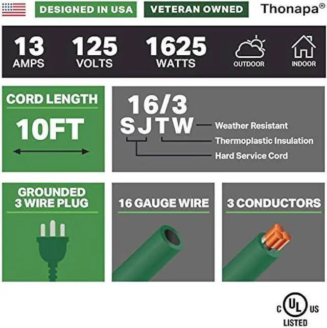 UL Listed - 3 wire extension cord, 10 foot, 13 amp, 125 volt, 1625 watt, SJTW.