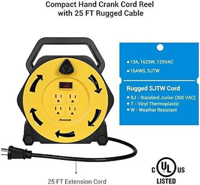 • 25 FT Durable Extension Cord Electric cord reel comes with 25 feet long 16/3 gauge SJTW wear and weather resistant extension cord; for indoor/outdoor (dry-location) use only