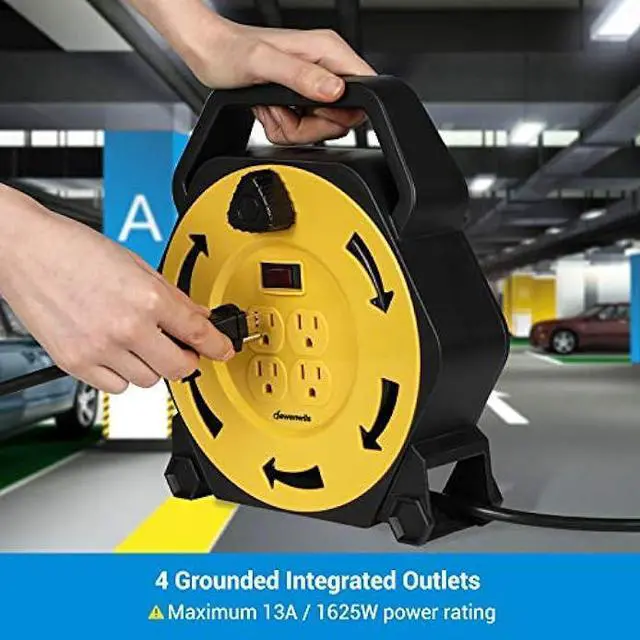 4 Built-in Grounded Outlets Rated for 13 amps, 125 volts, and 1625 watts, the heavy duty electrical cord reel power station has 4 integrated 3 prong outlets and allows you to power multiple tools at once