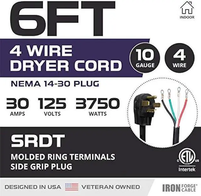 ETL LISTED, 4 wire dryer cord 4 prong, 10 gauge, 6 foot, 30 amp, 125/250 volt, 3750 watt, NEMA 14-30, SRDT. VETERAN OWNED.
