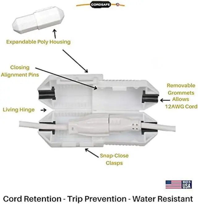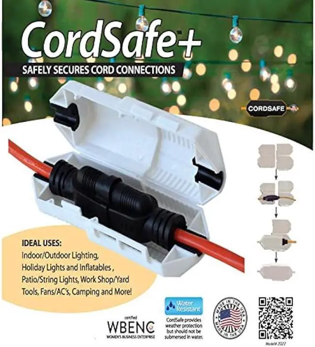 Protect your extension cord plug connections from getting pulled apart. CordSafe covers are weather resistant and protect your cord connections either INSIDE OR OUTSIDE against incidental disconnection and from the weather. Helps prevent breaker tripping! Safety first!
