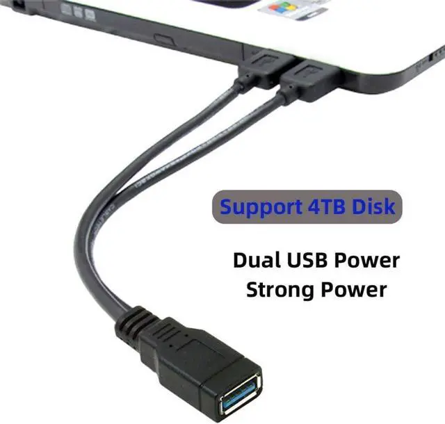 Cable allows for power to be taken from 2 USB ports, like a PC and External hard drive.