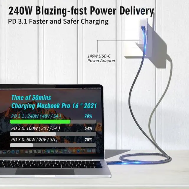 With advanced Power Delivery 3.1 technology, this cable provides up to 240W of charging power while maintaining 5A safe current output. The integrated E-Marker chip continuously monitors power flow, ensuring optimal charging efficiency for your MacBook, Dell XPS, Samsung Galaxy, and other compatible devices without risk of overcharging or short circuits.