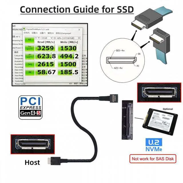 Data transfer rate up to 64Gbps, Transmits PCI Express 4.0 signals using the oculink protocol.