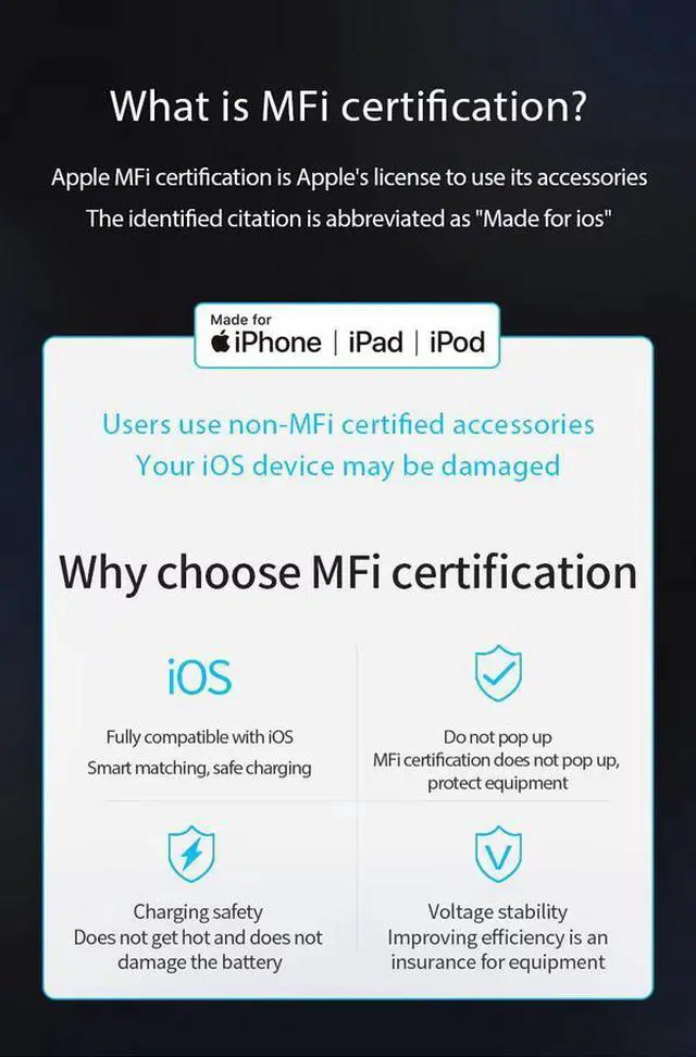 The SANGUAN MFi USB Type A to 8Pin Cable is designed to provide reliable and efficient charging and data transfer for your iOS devices and beyond. With official MFi (Made for iPhone/iPad/iPod) certification, this cable guarantees full compatibility and safety with Apple devices, ensuring seamless performance without the "unsupported accessory" warning.