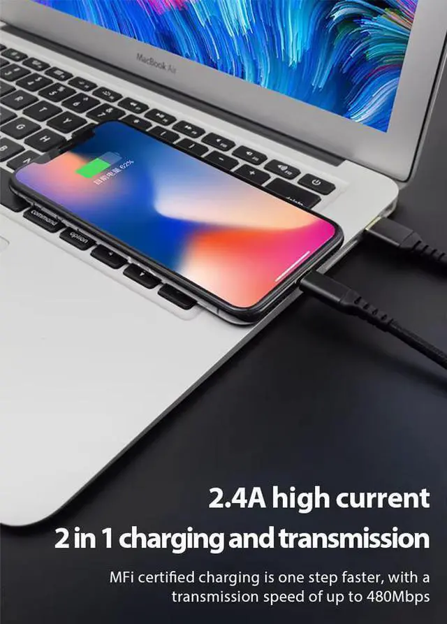 Supporting up to 2.4A fast charging, this cable powers up your iPhone, iPad, or other compatible devices quickly and safely. It also enables stable data syncing, allowing you to transfer photos, videos, contacts, and other files between your iOS device and computer or other USB-A host devices.