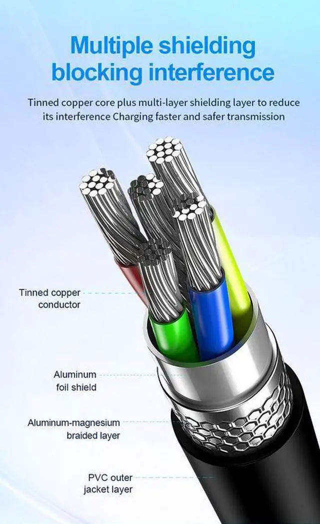 Built for durability and everyday use, the cable combines a premium aluminum alloy connector housing with a rugged nylon braided exterior, offering excellent resistance to fraying, tangling, and daily wear. The shielded design and high-quality tinned copper conductors work together to provide stable performance and protect against electromagnetic interference.