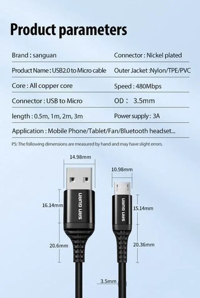 Power and connect your devices with efficiency and reliability using the SanGuan Micro USB Cable. Designed for 3A fast charging, durable construction, and seamless data transfer, this cable is the essential accessory for all your Micro USB gadgets.