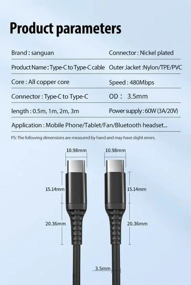 Power and connect your modern devices with the SANGUAN USB-C to USB-C Cable. Engineered for 3A fast charging, durable construction, and stable data transfer, this cable delivers reliable performance for all your USB-C smartphones, tablets, cameras, and accessories.