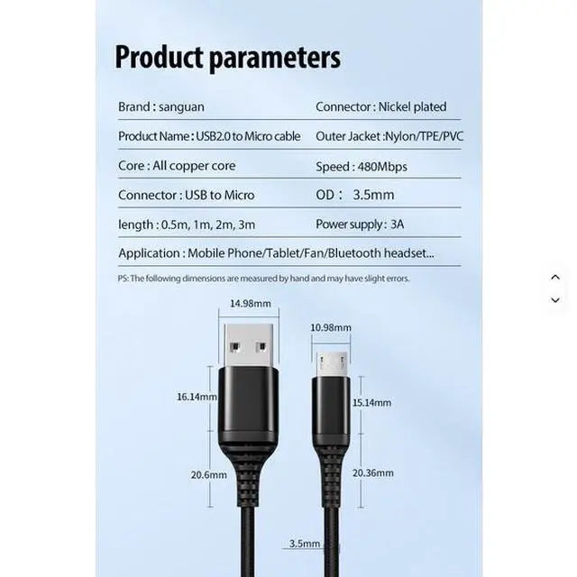 Power and connect your devices with reliability using the SANGUAN Micro USB Cable. Designed for 3A fast charging, durable construction, and stable data transfer, this cable is the essential accessory for all your Micro USB Android phones, tablets, and accessories.
