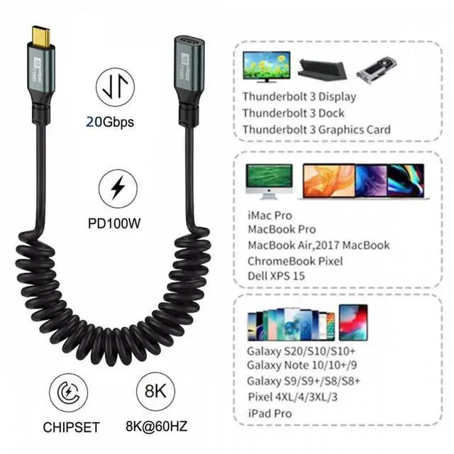 Stretch Coiled USB-C USB4 Cable 20Gbps 100W 8K for Laptop Keyboard Tablet Type-C Male to Female Extension Cable Power Data