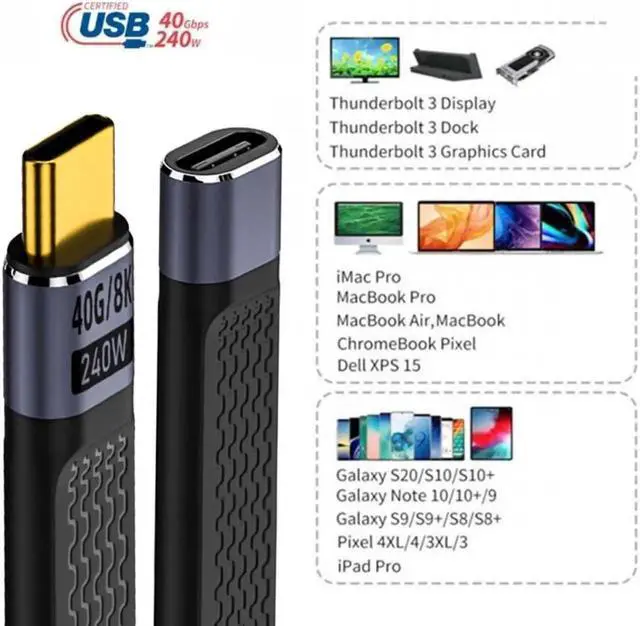 This USB4 Type-C Cable is widely compatible with Most of USB-C Devices (Mainly Laptops). backward compatible with Thunderbolt3, You can also connect with Hard Drivers and Docking Stations for Data.